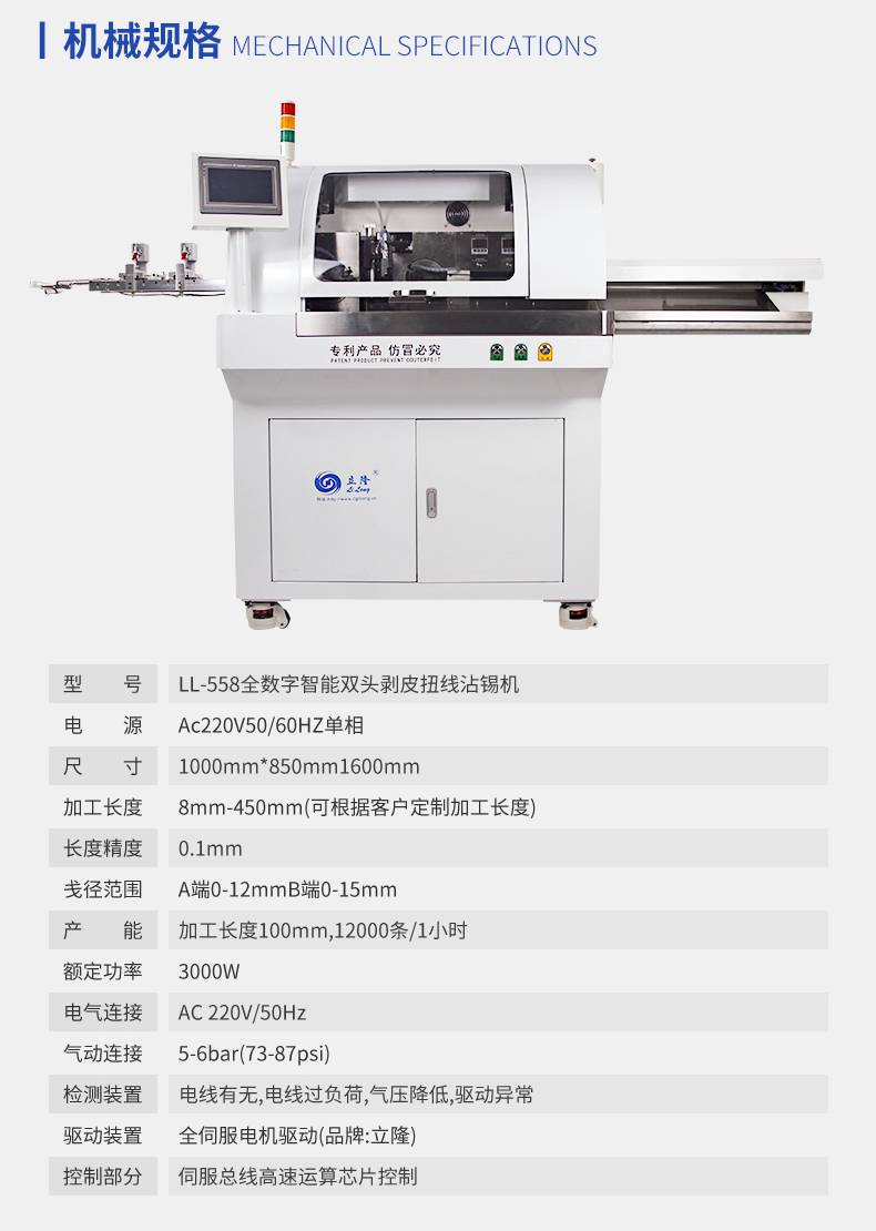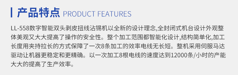 LL-558數(shù)字智能雙頭剝皮扭線沾錫機(jī)以全新的設(shè)計(jì)理念,全封閉式機(jī)臺(tái)設(shè)計(jì)外觀整體美觀又大大提高了操作的安全性。整個(gè)加工范圍都智能化設(shè)計(jì),結(jié)構(gòu)簡單化,加工長度用夾持拉長的方式保證了一次8條加工的效率電線無長短。整機(jī)采用伺服馬達(dá)驅(qū)動(dòng)讓機(jī)器更穩(wěn)定和更精確。以一次加工8跟電線的速度達(dá)到12000條/小時(shí)的產(chǎn)能大大提高了生產(chǎn)效率。